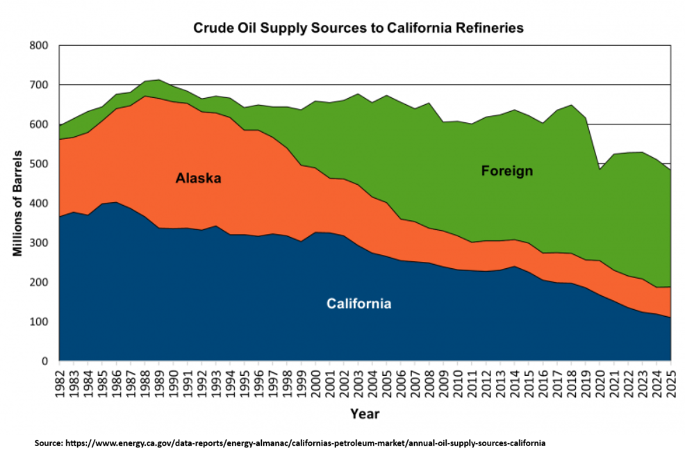 California has become heavily reliant on foreign oil, not because our overall use of petroleum disappeared, but because state policy made producing and processing local crude progressively harder and more expensive. The data tell the story: in 1985, 61.8% of the crude run in California refineries was produced in‑state and just 5.5% came from foreign sources. By 2025, in‑state production supplied only 22.9% of refinery feedstock, while foreign oil had jumped to 61.1% of the barrels processed in California refineries.